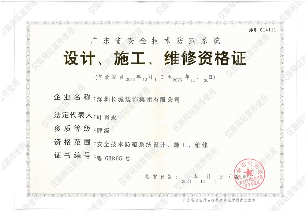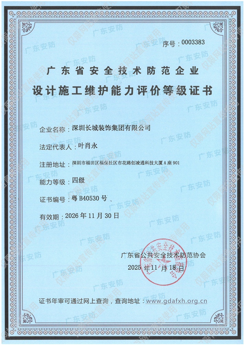 廣東省安全技術(shù)防范企業(yè)設(shè)計施工維護能力評價等級證書
