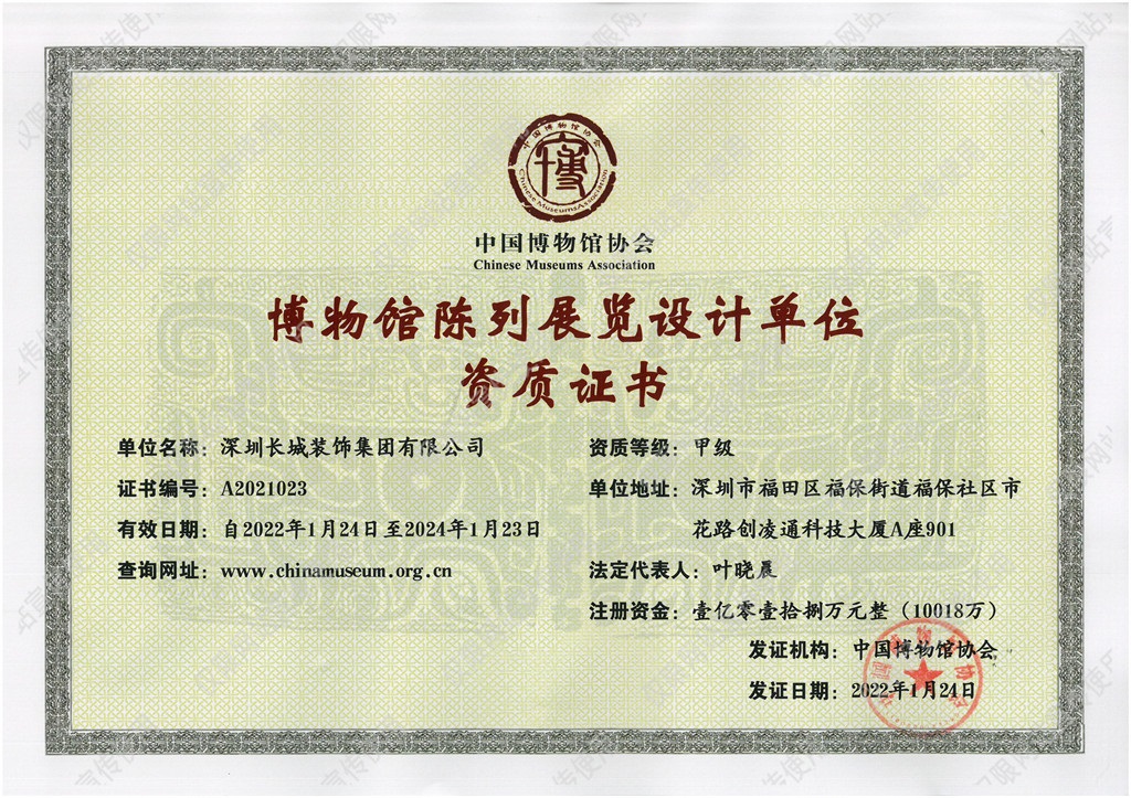 喜訊 | 深圳長(zhǎng)城裝飾集團(tuán)再添兩項(xiàng)“博物館展覽資質(zhì)”