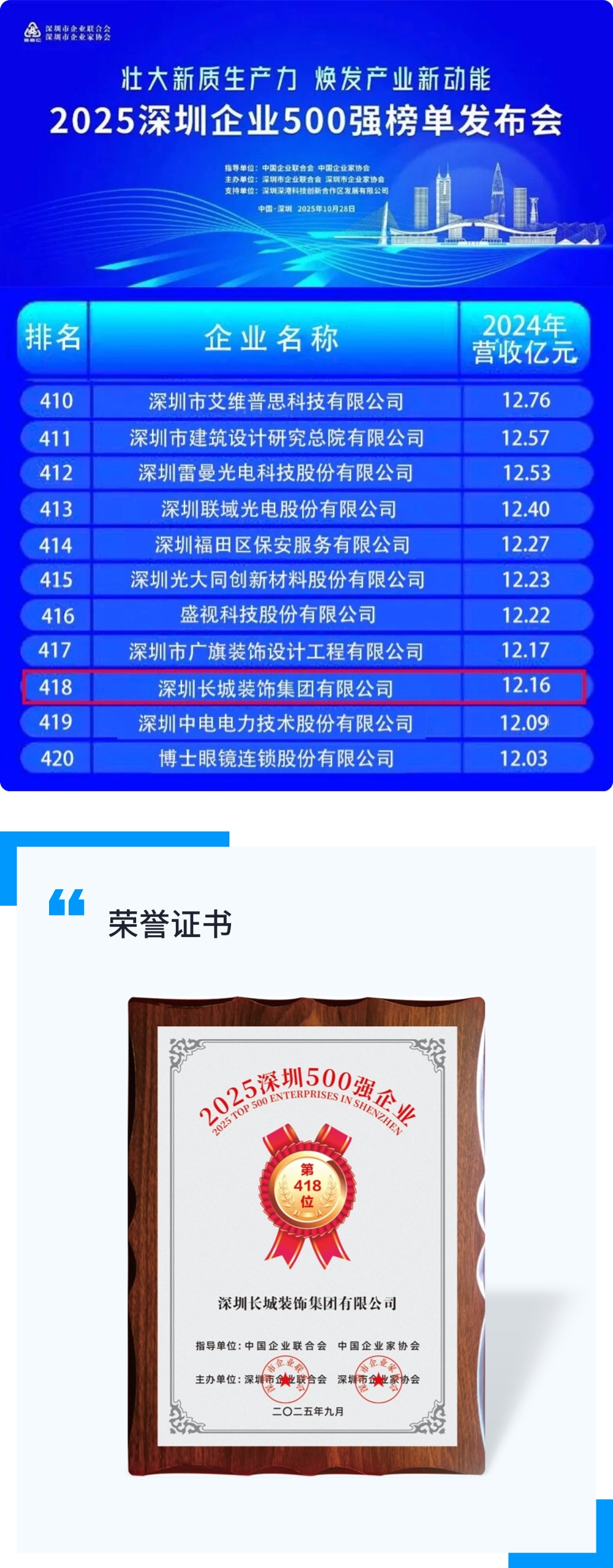 近日,深圳長(zhǎng)城裝飾集團(tuán)有限公司憑借卓越的綜合實(shí)力與行業(yè)貢獻(xiàn),成功入選2025年度“深圳企業(yè)500強(qiáng)”榜單。這一榮譽(yù)不僅彰顯了企業(yè)在裝飾行業(yè)的領(lǐng)先地位,也體現(xiàn)了其穩(wěn)健的發(fā)展態(tài)勢(shì)與持續(xù)創(chuàng)新的核心競(jìng)爭(zhēng)力。