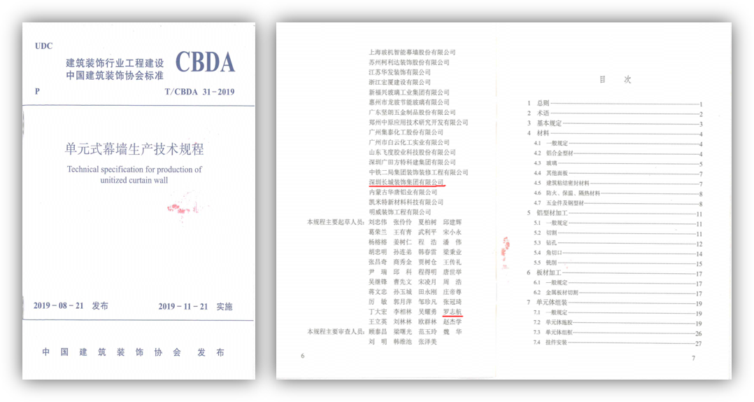2020-1-92019年8月21日,中國(guó)建筑裝飾協(xié)會(huì)發(fā)布了《單元式幕墻生產(chǎn)技術(shù)規(guī)程》,該技術(shù)規(guī)程由北京中新方建筑科技研究中心和沈陽(yáng)建筑大學(xué)共同編制,深圳長(zhǎng)城裝飾集團(tuán)有限公司為參編單位之一。