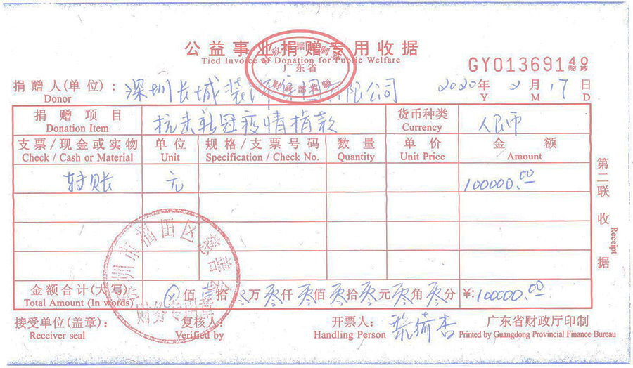 2020-3-4為積極應(yīng)對(duì)新冠肺炎疫情,眾志成城,共克時(shí)艱,攜手打贏疫情防控阻擊戰(zhàn),深圳長城裝飾集團(tuán)有限公司于2020年2月17日,向深圳市福田區(qū)慈善會(huì)進(jìn)行了愛心捐款10萬元,用于疫區(qū)疫情防控工作。