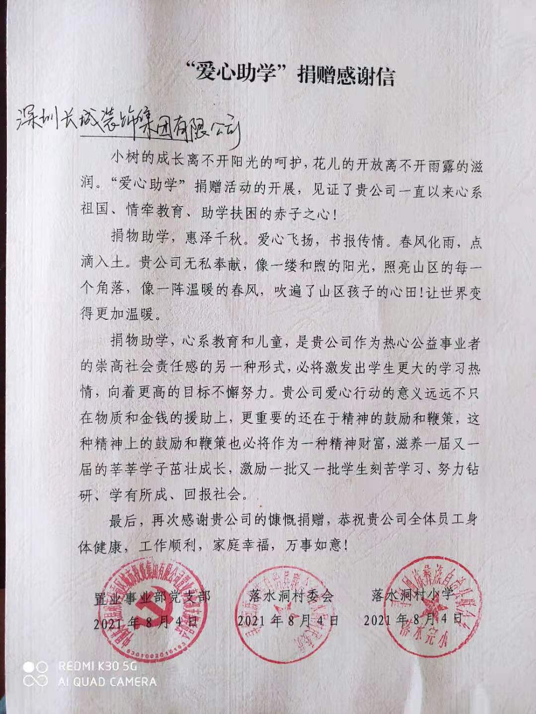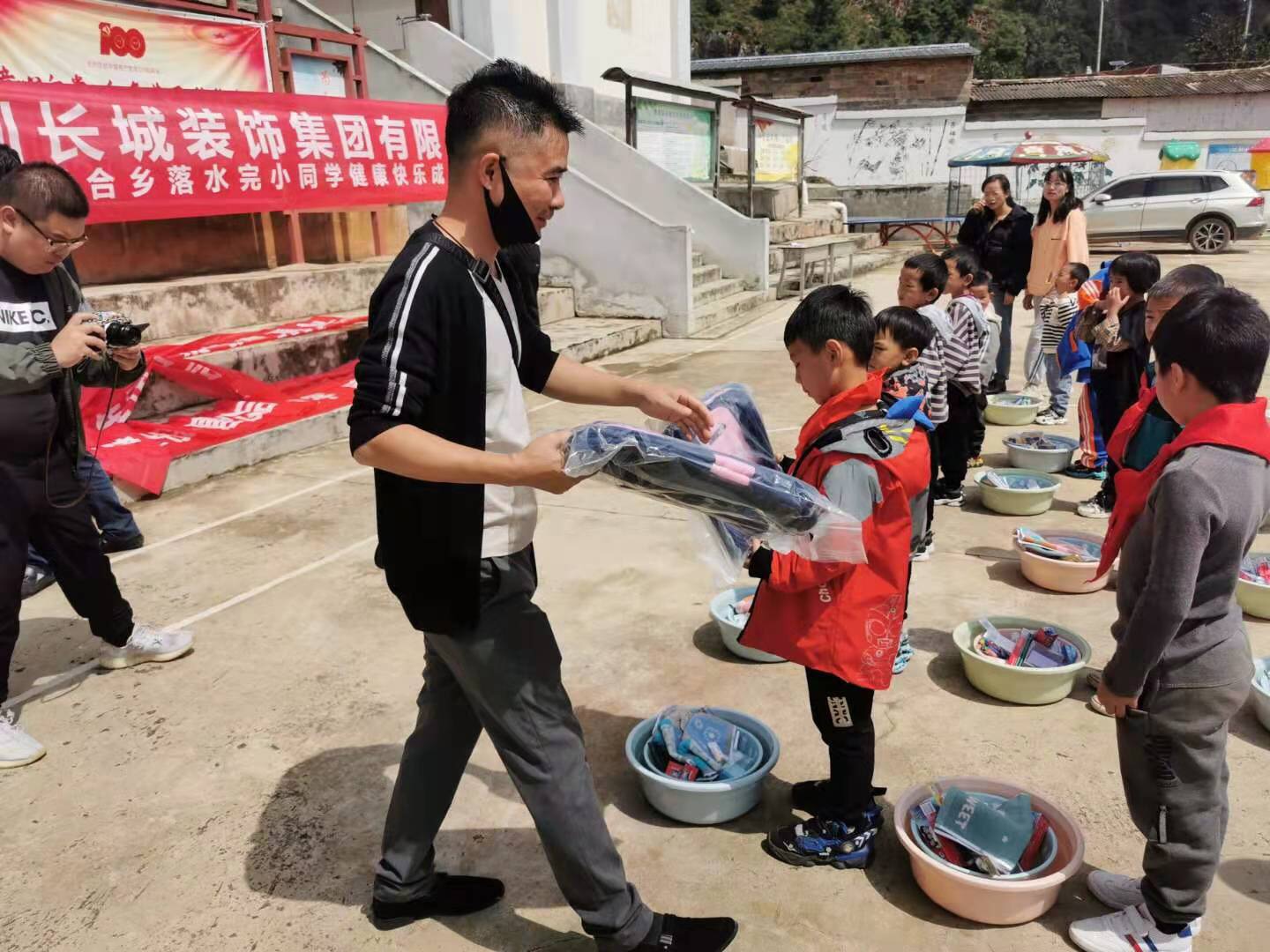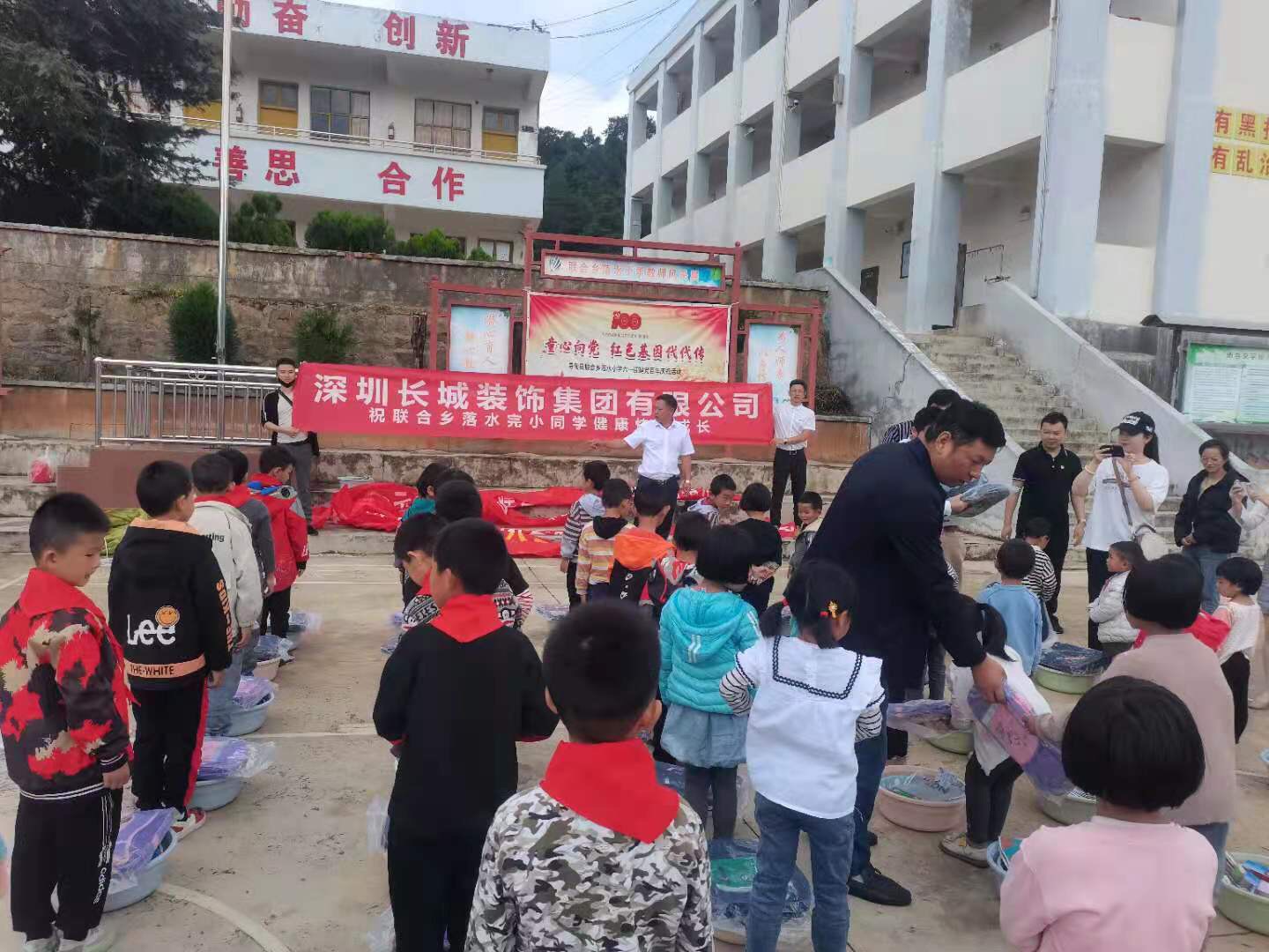 2021年8月4日,在云南尋甸回族彝族自治縣聯(lián)合鄉(xiāng)落水洞村小學(xué)舉行的“愛心助學(xué)”捐贈儀式中,深圳長城裝飾集團(tuán)有限公司代表向該校完成了捐贈物資交接。