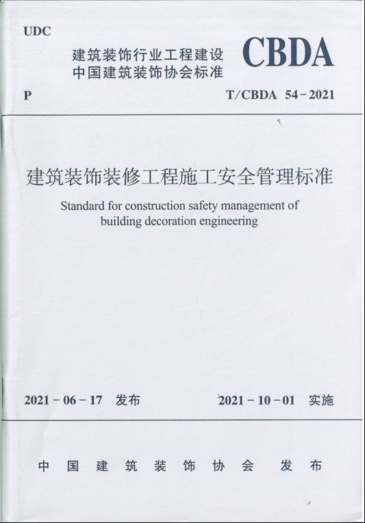 2021年6月17日,深圳長(zhǎng)城裝飾集團(tuán)參編的編號(hào)為T/CBDA 54-2021《建筑裝飾裝修工程施工安全管理標(biāo)準(zhǔn)》作為建筑裝飾行業(yè)工程建設(shè)中國(guó)建筑裝飾協(xié)會(huì)標(biāo)準(zhǔn)發(fā)布 ,將于2021年10月1日開始實(shí)施。