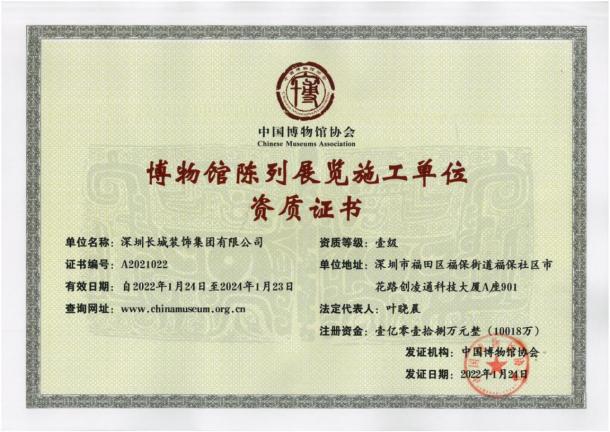 2022-1-28喜訊 | 深圳長城裝飾集團再添兩項“博物館展覽資質(zhì)”