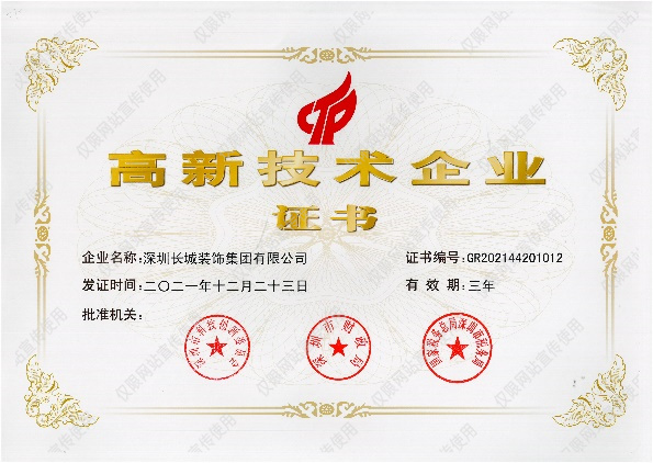2022-2-17近日,深圳長城裝飾集團獲得深圳市科技創(chuàng)新委員會、深圳市財政委員會、深圳市國家稅務(wù)局及深圳市地方稅務(wù)局聯(lián)合頒發(fā)的“高新技術(shù)企業(yè)”認(rèn)定,認(rèn)定時間為2021年,有效期為3年。這是公司自2017年首次通過 “高新技術(shù)企業(yè)”認(rèn)定以來,第二次被認(rèn)定為“高新技術(shù)企業(yè)”。