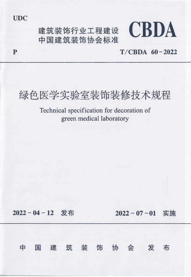 2022-8-29經(jīng)中國建筑裝飾協(xié)會批準,我司參編CBDA《綠色醫(yī)學(xué)實驗室裝飾裝修技術(shù)規(guī)程》(標準號T/CBDA60-2022)已正式出版,該技術(shù)規(guī)程于2022年7月1日起實施。