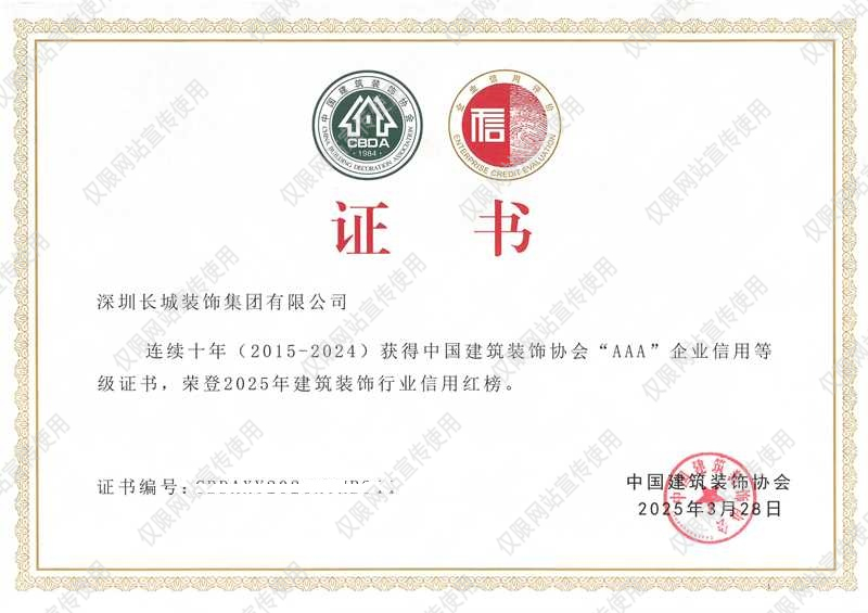 “AAA級(jí)信用企業(yè)”是建筑裝飾行業(yè)內(nèi)對(duì)企業(yè)信用等級(jí)的最高評(píng)價(jià),從企業(yè)資質(zhì)、財(cái)務(wù)狀況、履約能力、社會(huì)聲譽(yù)等多維度進(jìn)行嚴(yán)格評(píng)估。深圳長(zhǎng)城裝飾集團(tuán)連續(xù)十年獲此殊榮,不僅體現(xiàn)了其在工程品質(zhì)、客戶服務(wù)、合規(guī)運(yùn)營(yíng)等方面的卓越表現(xiàn),更彰顯了市場(chǎng)與行業(yè)對(duì)其長(zhǎng)期誠(chéng)信經(jīng)營(yíng)的充分肯定。并以高標(biāo)準(zhǔn)的項(xiàng)目管理和穩(wěn)健的發(fā)展戰(zhàn)略,為行業(yè)樹立了信用建設(shè)的典范。”
