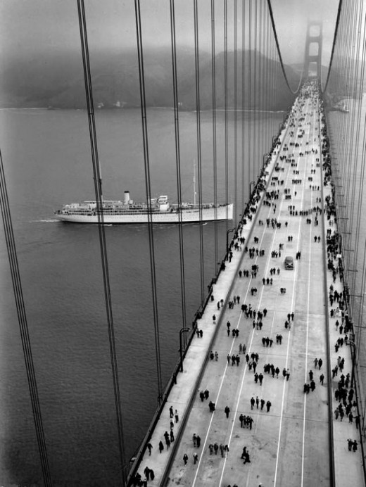1579年英國(guó)探險(xiǎn)家FrancisDrake發(fā)現(xiàn)了連結(jié)太平洋和舊金山的一個(gè)海峽,這就是后來(lái)的金門。盡管這個(gè)名字在1849年的淘金潮以前早就使用,但淘金潮使得金門(進(jìn)入北California的入口)成了加利福尼亞神秘魅力不可缺少的一部分。早在1872年就討論過(guò)要在金門海峽修建一座大橋的想法,但是直到1937年才在海峽上修了一座懸索橋。金門大橋橫跨南北,將舊金山市與Marin縣連結(jié)起來(lái)?;ㄙM(fèi)四年多時(shí)間修建的這座橋是世界上最漂亮的結(jié)構(gòu)之一。它已不是世界上最長(zhǎng)的懸索橋,但它卻是最著名的。金門大橋的巨大橋塔高227米,每根鋼索重6412公噸,由27000根鋼絲絞成。1933年1月始建,1937年5月首次建成通車。