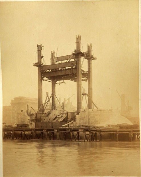在工程開始的階段,實(shí)際上有四個(gè)施工地點(diǎn),每一個(gè)都是鐵塔的支腳或者成為塔墩。這些塔墩直到180英尺之后才會(huì)匯合,而當(dāng)這些橋墩匯合之后必須能夠達(dá)到完美的水平,這個(gè)完美的水平面將會(huì)作為余下800英尺的建造基礎(chǔ)。塔墩如果建造的稍有差池,就會(huì)讓整個(gè)鐵塔傾斜。