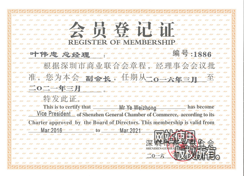根據(jù)深圳市商業(yè)聯(lián)合會(huì)章程,經(jīng)深圳市商業(yè)聯(lián)合會(huì)理事會(huì)會(huì)議批準(zhǔn),我司總經(jīng)理葉偉忠當(dāng)選深圳市商業(yè)聯(lián)合會(huì)副會(huì)長(zhǎng)。