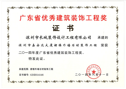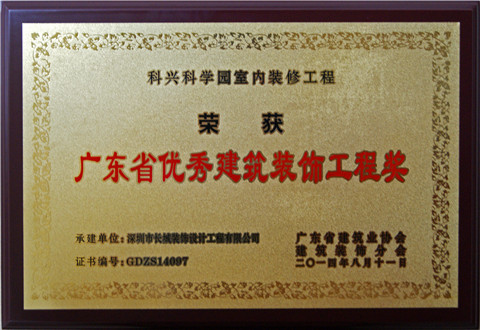 本次嘉安達(dá)大廈裙樓外墻石材裝飾工程、科興科學(xué)園室內(nèi)裝飾工程不僅獲得廣大客戶的認(rèn)可,還獲得深裝協(xié)的肯定,現(xiàn)在再次摘得廣東省優(yōu)秀建筑裝飾工程獎(jiǎng)的榮譽(yù)稱號(hào).在未來的發(fā)展上,長城裝飾將繼續(xù)發(fā)揚(yáng)品質(zhì)先行的精神,再創(chuàng)佳績!